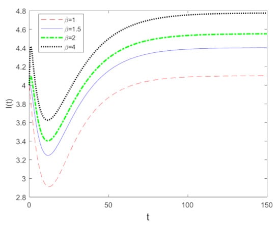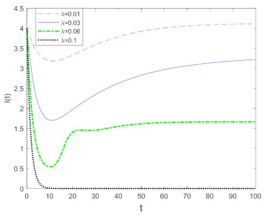 By taking parameters , , and , the plot in Figure 7 demonstrates how the number of the rumor-spreading people changes over time with different the system coming rates , such as , , and . From Figure 7, we can establish that when the system coming rate decreases, the number of rumor-spreading people decreases and eventually disappears. It shows that reducing the coming rate of the model can fundamentally restrain the spread of rumors. In order to reduce the coming rate , the government can take closed measures. If it is network communication, network blocking can be adopted. Network blocking refers to banning it from public communication on the network for someone or something in the whole network.