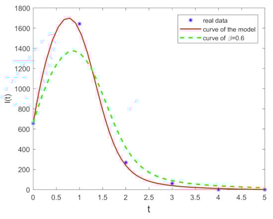 On 13 March 2020, according to the Mirror, the COVID-19 test of Bosonaro was positive. Bosonaro became the first head of state who was diagnosed with COVID-19. The major media reprinted one after another and soon attracted wide public attention. We attempt to use the rumor data of the event on the “Zhiweishijian” website [30]. On 13 March, as soon as the news was released, such as through microblog and Wechat, online media immediately reprinted and the number of rumor links increased to 657. On 14 March, the number of rumor links reached the peak of 1642. After the release of official rumor refutation information, the number of rumor links amounted to 268 on 15 March and only 61 on 16 March. Then, the accident subsided. By taking parameters , , , and , the time series diagram of the model was drawn by using Matlab software. It can be seen from Figure 8 that the curve of the model is roughly the same as the trend of the rumor data. On the other hand, on the condition that the other parameters mentioned above remain unchanged if the predation capacity drops to 0.6, Figure 8 shows that the peak value of the rumor will greatly reduce. As COVID-19 is closely related to public health and safety, it draws great attention from the public. Shortly after the news was launched, the false information was on a sharp increase. With the release of official rumor refutation information, the rumors declined rapidly and eventually disappeared.