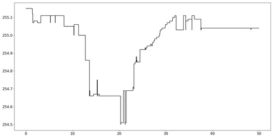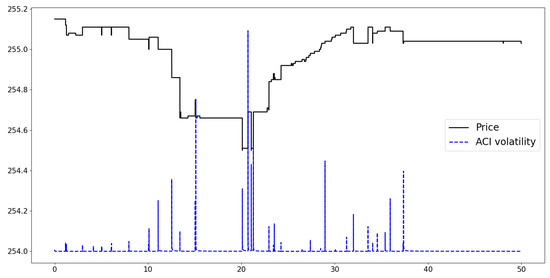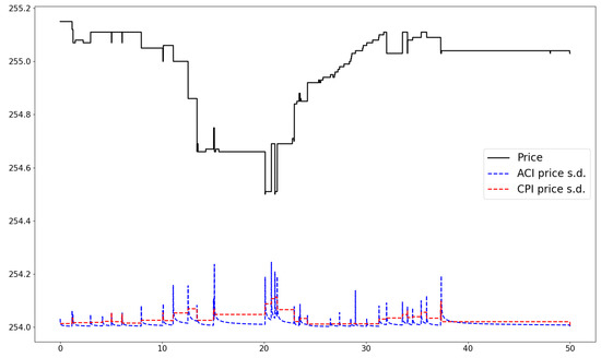 Figure 3 plots the evolution of quote price at the best bid in the first 50 s of AMZN stock on 2 January 2013. From this, we can observe that there is non-constant variation of bid price, with some intervals being much more volatile than others. A liquidity demander with 1 s of latency will encounter a high uncertainty and cost when she posts a (sell-side) market order at or , compared with the entering time at . Therefore, we need a method to effectively quantify the volatility of the quote price at any time and also the cost of demand for traders with different trading latencies.