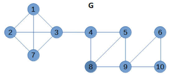 In our example, is the partition in ( is not a domatic partition of ) and it is of size Recall that is not a partition of is (first row, second column in Table 1). The union of the rest of the partitions is The spirit of the matching algorithm (Algorithm 2) is to complete the sets in with the rest of nodes, that is, with the nodes in such a way that the three final sets are a domatic partition of Using colours to explain the idea, if we imagine that each set of the partition is a different colour—for instance, that node 4 is dark grey, that nodes 5 and 8 are grid grey, and that node 9 is light grey—the domatic partition nodes in will keep their colour, and nodes in will be inserted in these sets in such a way that any two nodes sharing a set in will have the same colour. We iteratively incorporate nodes of to the sets of in order to provide every node v in with a neighbour in the sets to which v does not belong. In particular, we look for a pair of nodes, one v in and another in such that there is a set in which does not have common nodes with the neighbourhood of the former , and the second belongs to this neighbourhood For instance, nodes and satisfy both conditions: and Then, we add node 3 and the nodes sharing with node 3 a set in to the set in that had an empty intersection with the neighbourhood of 4, that is, we add nodes 2 and 3 to the set In terms of colours, nodes 2 and 3 will be the same colour as node 9 (see Figure 5), which makes sense since nodes 2 and 3 must be the same colour because they belong to the same set in Then, we remove from all the sets that contain nodes in and we add the nodes in the removed sets to the sets in with the common element. In the example, we remove sets and and we do not add anything to because both are sets with only one node. The resulting set of sets is the initial partition in the next iteration of the algorithm. We continue until is empty. Table 1 shows the evolution of and through the five iterations in the example. Finally, the domatic partition is This is illustrated in Figure 5.