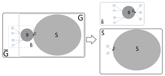 In Propositions 1–8 we will prove that the output of Algorithm 1 is a domatic partition. The main goal is to prove that the MC-AkDP problem of separable graphs can be solved by solving the MC-AkDP problem of one block and the MC-AkDP problem of a related connected subgraph. As we can recursively repeat this operation until the subgraph is non-separable, that is, a block, then the MC-AkDP problem of a separable graph can be solved by solving one MC-AkDP problem for each of its blocks. Figure 4 represents the elements that are used in the propositions. These usually are: