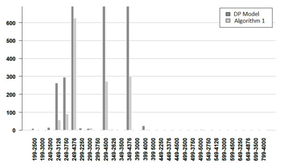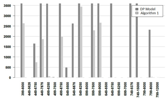 Figure 7, Figure 8 and Figure 9 give more details about the resolution time for solving the DP model and Algorithm 1. The vertical axis denotes the time and the horizontal axis indicates the instance. Each instance is named by its number of nodes and its number of edges. From these figures, it follows that most of the easy instances are solved in less than 5 s, and there are more DP bars than Algorithm bars. For easy instances, only one instance required more than 5 s, and the algorithm used less time for concluding. For medium instances, most of the times are very small, but when the time is larger than 10 s, the algorithm works faster. For hard instances, the bars for the DP model are always larger than the bars for the algorithm. Furthermore, in some cases, the algorithm time bar is negligible, while the DP time bar exceeds 2000 s.