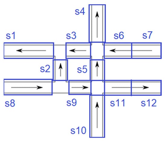 The computational domain, that is, the road network, is divided into approximately equal segments approximately equal in the number of computational grid points for uniform loading of processors (assuming the homogeneity of a multiprocessor system). It is natural to split the road network into segments (straight sections of roads that may contain narrowings/widenings, side entrances/exits) connecting intersections, which are the network nodes. These segments are sub-domains covered by the 2D Cartesian computational grid. As the number of grid points in the x-direction (the direction of the forward velocity) is much greater than in the y-direction (across the road) the grid is never split along the y-direction, but long road sections can be additionally split along the x-direction if necessary. As an example, Figure 1 reflects decomposition of a small road network with one-way traffic into twelve segments (si denotes the i-th segment, and, what is the same, the i-th sub-domain, i = 1, …, 12), and arrows indicate the direction of the forward velocity. In the case of two-way traffic, road segments in different directions should be different sub-domains.