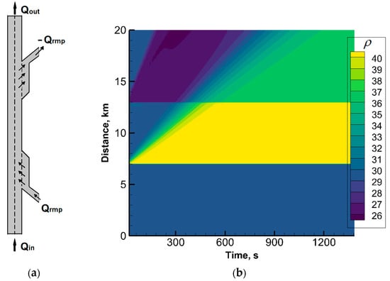 The spatiotemporal diagram of the obtained effective density is depicted in Figure 2b. Comparison with similar problems from [] allows us to conclude that the sample demonstrates the impact of bottlenecks correctly.