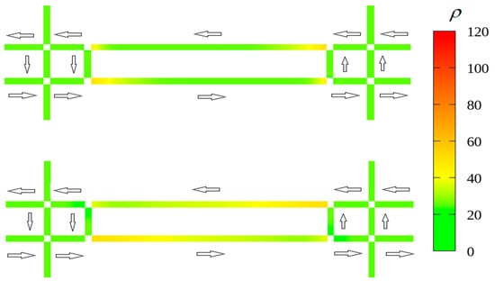 Figure 5 presents the obtained effective density fields for two successive time moments. Arrows indicate the direction of movement on road segments, which are processed by different processors like it is illustrated by Figure 1. Boundary conditions (7) and (8) are satisfied in all nodes. In this case, fluxes in all nodes are distributed uniformly.