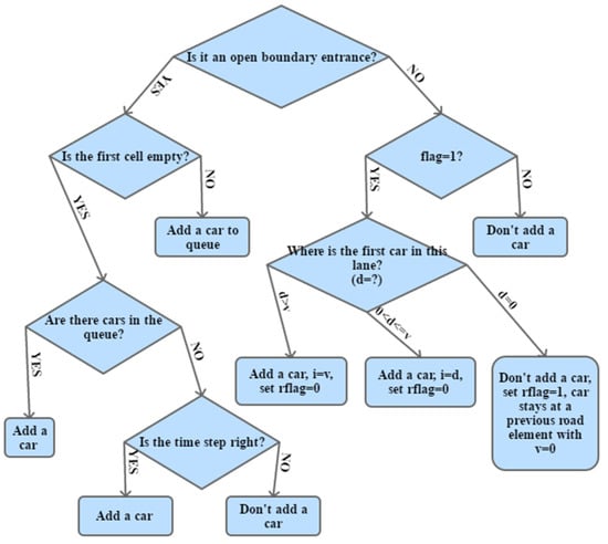 It is known that for computing logical operations in parallel, CPU is suited better than GPU, so the former route was chosen. The code is written using C/C++, and the MPI library is used for boundary condition exchange. Given the chosen parallelization method, though, it should be noted that data exchange requires additional steps. Basically, we have road elements that are calculated on different processors, and we need to exchange data when a car exits one element and enters another. However, if a traffic jam is formed in the target element, the car might not be able to enter it. In order to simulate this situation correctly, the boundary condition exchange algorithm has been created. It consists of two parts. The first one is shown in Figure 7 and it corresponds to vehicles’ entering a new element, from a different element/processor or entering the computational domain for the first time. If it is an open boundary entrance, the availability of the first cell is checked. If the cell is available, the car enters, if not, it is added to the queue, where it will wait till there is an unoccupied cell for it. If it’s an element in the middle of a road network, first thing the marker “flag” is checked, flag = 1 means that there is a vehicle that wants to enter.