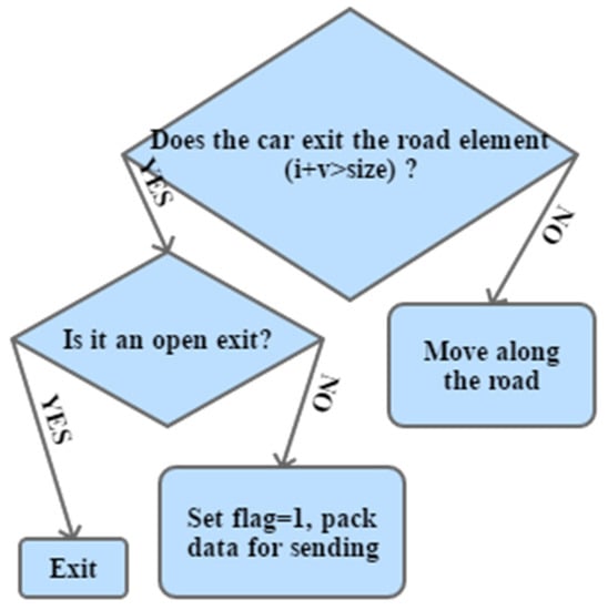 When a car nears the boundary of the element and is ready to exit, the “flag” marker is set to 1 and is sent to the next element/processor, in case if there is one. If it is an open boundary, the car exits the computational domain.