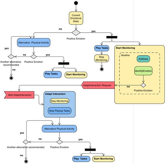 Before starting any interaction, the algorithm gets the child’s emotional state from the coordinator. If the state is a negative one, namely, angry, the application will give the child a timeout and propose some entertainment activities in order to change the child’s emotional state. After the execution of the entertainment activities, the emotional state is obtained again. If it is still a negative one, the previous steps are executed again; otherwise, the normal interaction flow will start. Before starting this flow, the emotional state monitoring activity is started by calling the StartMonitoring Service from the coordinator. If after executing the relaxing physical activities for a predefined number of times (called ), the state of the child is still a negative one, then the interaction stops. We consider that, in this case, the child’s emotional state does not facilitate learning.