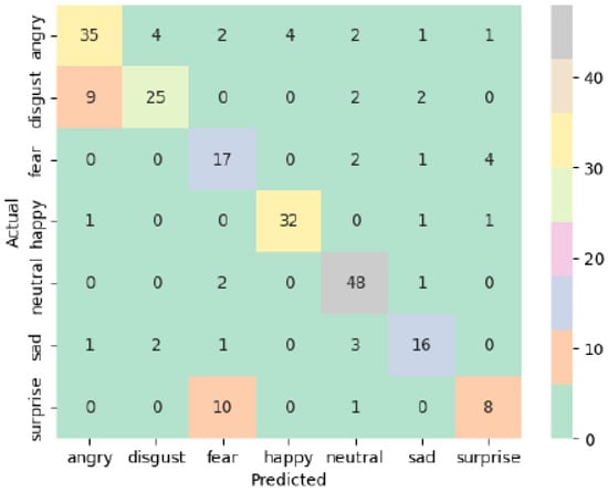 We also investigated the performance of our models in the case of children faces. The Child Affective Face Set (CAFE) [30] was used in this scope. This dataset contains 1192 photographs of 154 children. In this scenario, our second model scored the best accuracy, with an average of 75.73% (see the confusion matrix from Figure 6) and resolved some of our problems with the confusion between some of the classes. However, a liability of this model is that the loss remained on a higher value and the confusion between disgust and angry and the one between surprise and fear persisted.