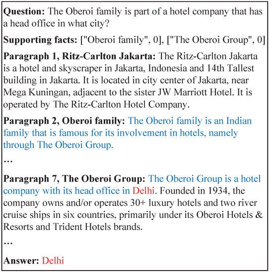 We evaluate competing methods on HotpotQA benchmark (https://hotpotqa.github.io, accessed on 27 February 2018). HotpotQA is the first multi-hop QA dataset concentrating on the explanation ability of models, based on Wikipedia articles containing many domains, e.g., education and history. The dataset is constructed in the way that, given multiple documents, crowd workers are required to provide a question, corresponding answer and support sentences, which are used to reach the answer as shown in Figure 3. The gold documents annotation can be derived from the support sentences annotation. There are about 90,000 training samples, 7400 development samples, and 7400 test samples. Please refer to the original paper [8] for more details.