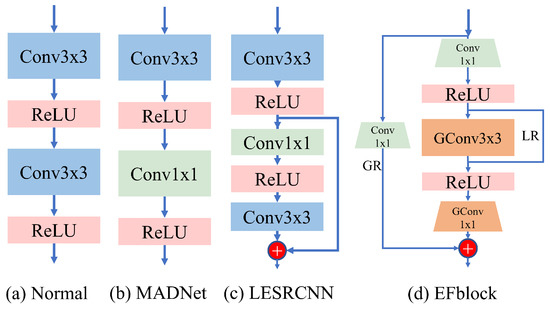 As shown in Figure 2, many lightweight super-resolution methods use either a scale of 3 × 3 convolutional layers or 1 × 1 convolutional layers to extract features. We believe that the features extracted in this way are inefficient because adding a 3 × 3 convolutional layer increases many parameters. In light of that dilemma, and inspired by other efficient networks [35,36,41], we designed a lightweight and efficient feature extraction module, EFblock. Its performance is stronger than the standard convolution, and its parameters and calculations are relatively small. We first use a point convolution layer to upgrade the original image to the size that needs to be processed, then use grouped convolution, where, to extract features, the input size is equal to the output size. Finally, grouped point convolution is used to promote the feature to the dimension of the output. This combination of grouped convolution and point convolution can effectively reduce parameters and calculations.