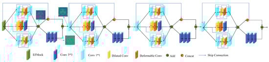 When using a standard convolutional layer, the size of the receptive field depends on the size of the convolution kernel. Some methods such as MRFN [13], which uses repeated stacking of 3 × 3 convolutional layers to obtain a large receptive field, will lead to a large increase in the number of parameters and calculations. To minimize that problem, we use dilated convolution and a control dilation factor r to control the size of the receptive field. The operation of dilated convolution can be stated as