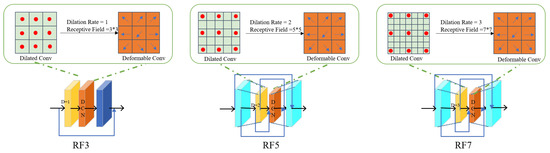 The dilated convolution [20] operator of dilation r can be referred to as . Figure 4 shows that, by using dilation factors of 1 and 2 and 3, we can obtain the receptive fields of 3 × 3, 5 × 5 and 7 × 7.