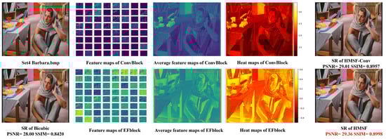 Figure 5 shows all 64-dimensional features as well as the heat map of the features, the average features, and the SR image result extracted by Convblock and EFblock when Barbara.bmp in Set14, 2×, is processed. From the total features, it can be seen that the color extracted by the Convblock is dark, and many features are almost black. This shows that these feature maps are not effective; in contrast, the EFblock feature maps include almost all effective knowledge. The heat map makes clear that the features extracted by EFblock are richer, especially the details; furthermore, the color contrast, such as for the several items on the desk, is sharper. The final HMSF-EFblock also yields higher PSNR and SSIM values for Barbara.bmp. Table 4 shows the use of Convblock and EFblock to train the HMSF model. We used 2× three general datasets for testing. The number of parameters of HMSF-EFblock is 3000 less than that of HMSF using Convblock, with fewer multi-adds, too. HMSF-EFblock excels in all three datasets, especially in Manga109 and Set14. The ablation experiment shows that, compared with Convblock, the efficient and lightweight feature-extraction module EFblock has the advantages of a small number of parameters and calculations, while performing quite well.