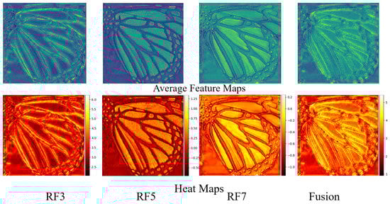 Local multi-scale is mainly used for texture features. Convolutional layers with different receptive fields can extract texture features with different thicknesses and precision. Figure 6 shows the feature maps and heat maps extracted from the RF series of multi-scale modules with different receptive field sizes. It can be seen that, as the receptive field increases, the extracted texture features become more and more concise, from fine details to image contours. The fusion image shows the fusion result of texture features with different levels of fineness: both fine features and rough contours.