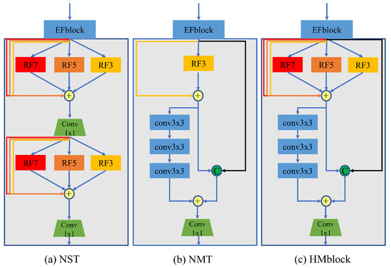 An overview of HMblock. HMblock includes the local multi-scale feature extraction module RF and the global residual connection used to extract the global multi-scale features, which together constitute the hybrid multi-scale features.