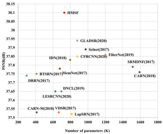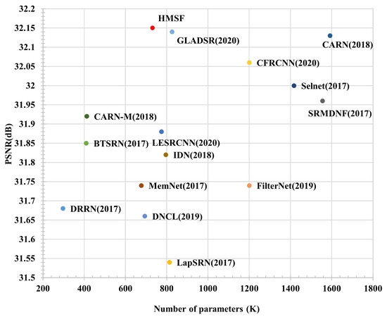 As shown in Table 7, we compare our proposed HMSF with several state-of-the-art lightweight SR methods, including SRCNN [15], FSRCNN [16], VDSR [17], DRCN [29], LapSRN [8], DRRN [7], IDN [11], CARN [10] and MRFN [13], from 2014 to 2020, with a total of 18 methods. We compare our proposed HMSF on five common datasets, using two common quality evaluation indicators: PSNR and SSIM. To further evaluate the model parameters, memory usage, and multi-adds (Madds), we compare several methods to obtain 1280 × 720 pictures as the benchmark to calculate the above indicators.