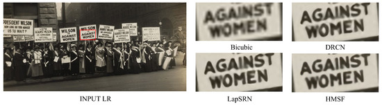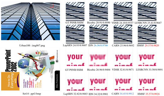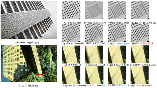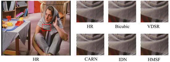 As previously mentioned, our HMSF achieves better performance in terms of PSNR/ SSIM and visualization quality. However, many deep-learning-based models [10,11,17,34] (including our HMSF) share a problem, as shown in Figure 17: none of the methods can correctly restore the direction of a stripe from the input of a bicubic low-resolution image. In a bicubic image, stripes are displayed as staggered black and white pixels; each white/black pixel connects the next black/white pixel in two contrary directions. Such a phenomenon will mislead trained models to yield undesirable results.
