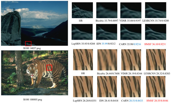 In keeping with most existing methods, we also evaluated the effectiveness of the developed network on the following benchmark datasets: Set5 [49], Set14 [50], BSD100 [51], Urban100 [52] and Manga109 [53]. Among these datasets, BSD100, Set5, and Set14 consist of images with natural scenes; Urban100 contains urban scenes; and Manga109 consists of Japanese manga pictures with rich colors. As usual, we used bicubic interpolation to downsample the image to obtain the LR/HR image pair. By convention, we converted the picture from RGB format to YCbCr format, evaluated only the Y channel, and used bicubic interpolation to upsample the color components.