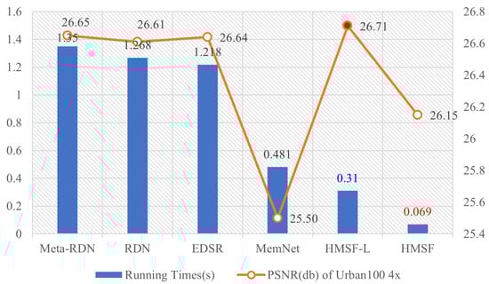 NMT and HMblock in Figure 7 represent the differences between local single-scale and multi-scale texture-extraction structures. We kept the local and global residual connections, and adjusted only the number of local multi-scale modules, RF. The HMSF-NMT in Table 4 represents a model that uses a local single-scale structure during texture extraction. Although the parameters and calculations of the local single-scale structural model are slightly reduced, the performance is greatly reduced, and each test dataset declines. Among them, the decline in Urban100 is the most obvious. Experiments show that local multi-scale texture features are very important for reconstructing local details of the image.