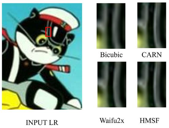 As a powerful image processing tool, super-resolution is widely used. In the real world, however, there are few LR-HR image pairs that can be evaluated for image quality. To simulate a real-world scenario, we followed the methods described in [8,56], using some real-world images to test ours. Because there are no HR images that suit these real-world images, we provided just the visualized results to be evaluated. Figure 15 shows a real-world historical image, processed with factor 2×; in the visualized comparison, it can be detected that our HMSF restored font details better. Figure 16 shows a visualized test result on the real LR image, Cat.png, which was more difficult to process because of its blur. Compared to the results of LapSRN [8], Waifu2x [68] and CARN [10], the image processed by HMSF appears with a sharper edge as well as a purer black color.