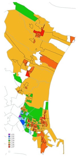 The methodology employed has allowed verification of how the PCA satisfactorily resolves the problem of the multidimensionality of deprivation, as shown in other studies []. Not only was an appropriate classification of the different census sections according to deprivation level achieved, but also results were obtained that agreed with the hypothesis initially proposed.