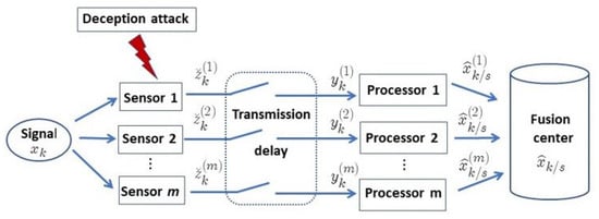 Motivated by the above analysis, our aim in this paper is to address the distributed fusion estimation problem in WSNs subjected to the three situations described above, as often encountered in real life: Deception attacks, one-step random transmission delays and measurement noises cross-correlated between sensors and correlated with the signal. To the best of our knowledge, this problem has not been considered previously, although some papers have discussed deception attacks and delays or correlated noises. Specifically, for a single sensor, the estimation problem is studied assuming deception attacks and random communication delays in [29,30], and in a multi-sensor environment, ref. [31] investigated the distributed filtering problem in WSNs receiving deception attacks and when sensor additive noises are both cross-correlated and correlated with the process noise.