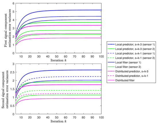 Performance of the local and distributed estimators. Figure 2 illustrates the local and distributed prediction and filtering error variances for of the first and second signal components. For each signal component, this figure shows, on the one hand, that the error variances of the distributed estimators are lower than those of local ones; hence, the distributed fusion estimators provide better estimations of the signal. On the other hand, this figure reveals that the performance of the estimators improves as more observations are used; that is, the error variances of the local and distributed filters are smaller than those of the predictors, and these predictors became more accurate as s increases.