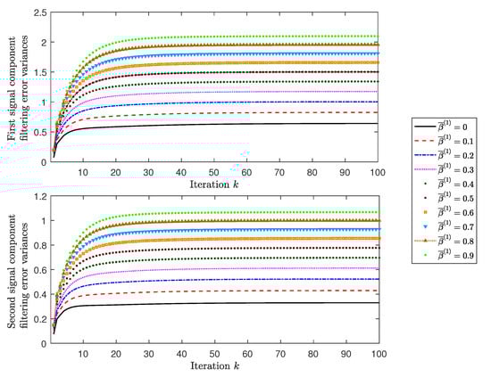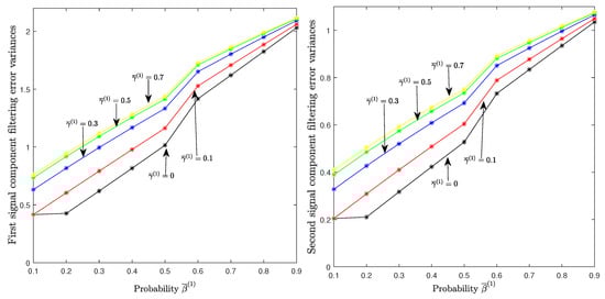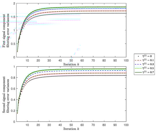 Influence of deception attacks. To analyse the effect of deception attacks, let us assume different values of . Figure 3 shows that the distributed filtering error variances for both signal components decrease in line with the probability of success . Hence, as expected, better estimations of the signal are obtained for lower values of successful attack probability and the best ones are obtained when , since in this case Sensor 1 has not been attacked. A similar analysis for different values of as well as for the distributed prediction error variances leads us to the same conclusions.