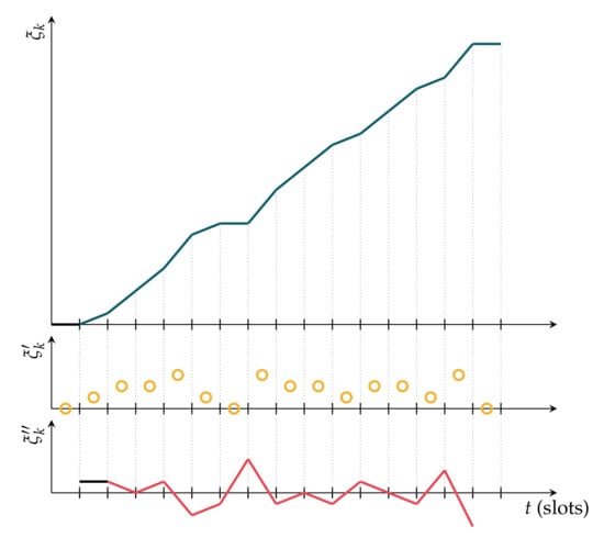 In order to illustrate the use of the proposed theoretical framework to evaluate the behavior of a routing protocol, Figure 1 shows a temporal sequence in an arbitrary node. In this figure, on the central axis we represent the packet sending events; on the upper axis we illustrate the evolution of the accumulated exposure. Finally, the axis at the bottom shows the pace of exposure accumulation. From a protocol point of view, the objective is twofold: first that the accumulated exposure of each node k, , is kept as low as possible; second, that the rhythm of exposure accumulation is compensated among all nodes within the network.
