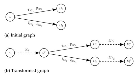 As an illustrative example, Figure 2 shows the transformation applied to a simple graph of three nodes. Here, and are the traffic load and the required transmission power, between nodes i and j, respectively. On the other hand, models the overall exposure caused by node i up to a certain time. It can be easily inferred that the proposed transformation increases the complexity of the graph; if we start from an initial graph , we obtain a new one , where and .