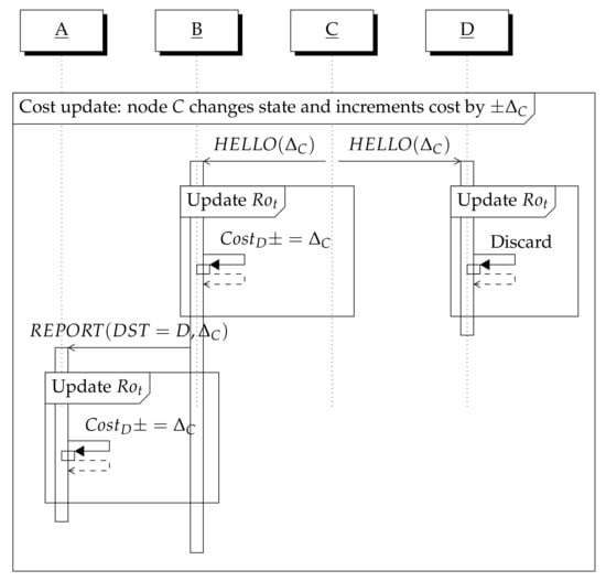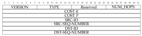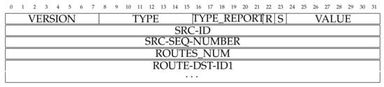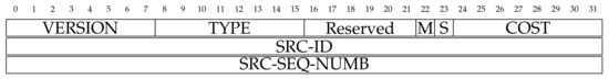 - REPORT: used to disseminate a cost change, either an increase or a decrease of the accumulated exposure. Although the accumulated exposure does not physically decrease, the protocol considers this option to include aging functions. For instance, if a node is not used for a while, the cost related to the accumulated exposure can be reduced to foster the use of such a node. It thus follows a HELLO with M = 1, and it is propagated to ensure that all affected nodes receive the information. Figure 5 illustrates the format of this message.