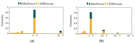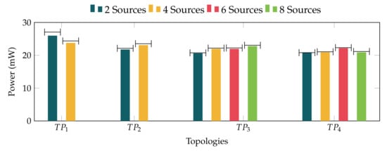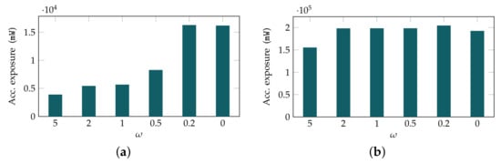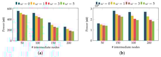 Afterwards, we also evaluated the impact of the parameter over the accumulated transmitted power. Figure 13a shows its standard deviation for different values of . We can see a clear influence of the cost, resulting in a much more homogeneous exposure when the factor is higher. Besides, Figure 13b also illustrates the power that was transmitted by the entire network. In this setup we can also see a slight improvement for the highest value, which was not expected, since higher values usually lead to using routes that are not favoring the minimum power criterion. However, the traffic balancing between the various routes leveraged by this configuration causes fewer collision events and re-transmissions.
