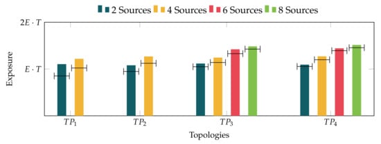 According to the previous definitions, the exposure induced by a node grows according to how it sends packets. It is worth highlighting that the theoretical model is not constrained by the power used to send each packet, but it only considers the event of sending. Depending on the technology, as well as on the power used to reach the next hop within the route, the accumulated exposure will grow differently.