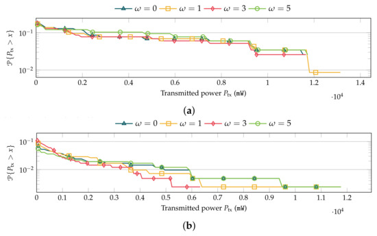 CCDF of the power transmitted by each node. (a) 50 intermediate nodes. (b) 200 intermediate nodes.