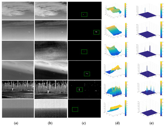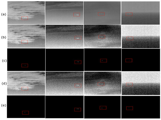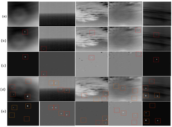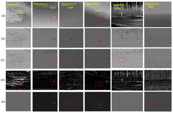 Following rows (a–e) depicts the background suppression result on six original image sequences: (a) Original six image sequences (b) Max-mean (c) Max-median and (d) Top-hat (e) IPI.