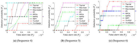 The output of the presented technique against the baseline approaches can be seen in Figure 6, which is represented by an ROC curve. Figure 7a shows that the IPI and RPCA methods produced better results than the proposed method. The suggested methods improved detection ability because of TV term introduced in the BPI, which smooths the background and successfully detects the target. In addition, NIPPS did not get a decent outcome for sequence 1. Figure 7b shows that the TV-PSMSV did not produce good results when related with the RPCA method. Figure 7c shows that the TV-PSMSV technique had the highest performance, followed by IPI, and that the rest of the other methods performed poorly. Figure 8a shows that the suggested TV-PSMSV method, when compared to other methods, produced good results; however, NIPPS had weak detection ability. The suggested TV-PSMSV approach had the best detection rate, followed by IPI, as shown in Figure 8b. Finally, because of adding the TV term with the input scene, it can be observed from Figure 8c that the suggested technique had strong detection ability.