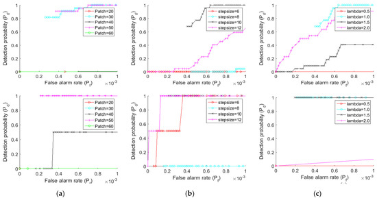 Similarly, the step size must be adjusted properly. In the experiment, the patch size was set to 30 × 30, and then step sizes of 6, 8, 10, and 12 were explored. The ROC curve on step size shows that adopting a small step increases computation time and reduces the algorithm’s detection performance. Reduce calculation time by increasing the step size to a large amount. Figure 9b indicates that a step size of 10 is the optimum option.