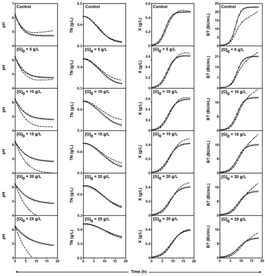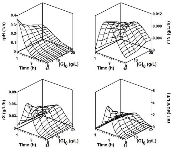 In the case of Equation (2), negative values for d, e, f, and g, and positive values for h were obtained (Table 4). The decrease in the absolute values obtained for d and e could be related to the reduction in the TN consumption rates and the increase in the final TN values observed with the increase in [G0] (Figure 1). Similarly, the values of f, g, and h were almost similar for all cultures because the TN consumption decreased with the increase in [G0], in parallel with the reduction in biomass production, nisin synthesis, and pH drop (Figure 1).