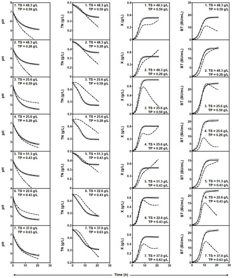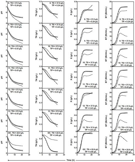 In fact, the rates of culture pH drop (rpH), total nitrogen consumption (rTN), and biomass (rX) and nisin (rBT) production in the different experiments (1–14) did not show a clear dependence on changes in initial TS and TP concentrations (Figure 6).