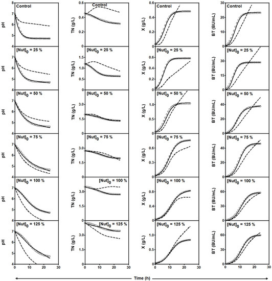 For these reasons, it is very difficult to develop a general four-dimensional predator-prey system to explain the variations in the time courses of the four variables (culture pH, TN, X, and BT) for each or all series of cultures. In addition, with the use of a general four-dimensional equation, the effect of different initial culture conditions on the evolution of the four dependent variables could not be explained, leading to a misinterpretation of the kinetics of the cultures.