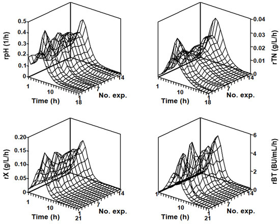 From the detailed observation of Figure 5, it can be noted that the highest rpH(t), rX(t), rBT(t)), and rTN(t) were obtained in the unsupplemented DW substrate during the first 4, 8, 9, and 12 h of fermentation, respectively. However, after these times, the four rates in the unsupplemented DW medium were lower than the corresponding rates calculated in the glucose-supplemented cultures.