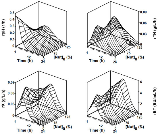 In this series of cultures, the increase in the MRS nutrients added into the DW medium affected both the evolution of the culture variables and the final concentrations of biomass and nisin obtained (Figure 4), as well as the rates rpH, rTN, rX, and rBT (Figure 7). The rates of culture pH decrease exhibited a transition from exponential decay-shaped curves (in the DW25, DW50, and DW75 media) to bell-shaped curves (in the DW100 and DW125 media); meanwhile, the rTN, rX, and rBT profiles showed bell-shaped curves [25]. However, the rpH, rTN, rX, and rBT profiles did not show an appreciable relationship (linear, quadratic, sigmoidal, etc.) with the initial MRS nutrient concentration ([Nut]0) in the medium.