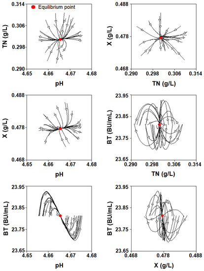 In addition, the predictions of the four-dimensional predator-prey system (1)–(4) for each response variable (solid lines in Figure 1, Figure 2, Figure 3 and Figure 4) were in perfect agreement with the corresponding experimental data. This indicates that the developed four-dimensional predator-prey system (1)–(4) is consistent and robust enough to accurately describe the trend observed in the experimental data of culture pH, TN, X, and BT.