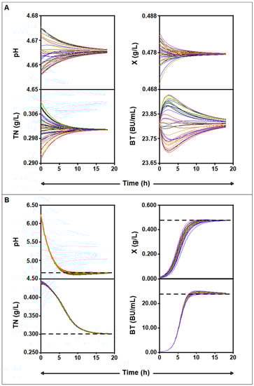 In the series of cultures DW-TS-TP, the effects of the initial TS and TP concentrations on both the growth and bacteriocin production were described by empirical quadratic equations [17]. The inclusion of terms for explaining these effects in the four-dimensional predator-prey system (1)–(4) could contribute to obtaining a general equation for describing the evolution of the four response variables (pH, TN, X, and BT). However, this approach has several drawbacks since too large equations could be obtained, and information about the true relationship between the dependent variables (pH(t), TN(t), X(t), BT(t)), and the own essence of the LV equation would be lost.