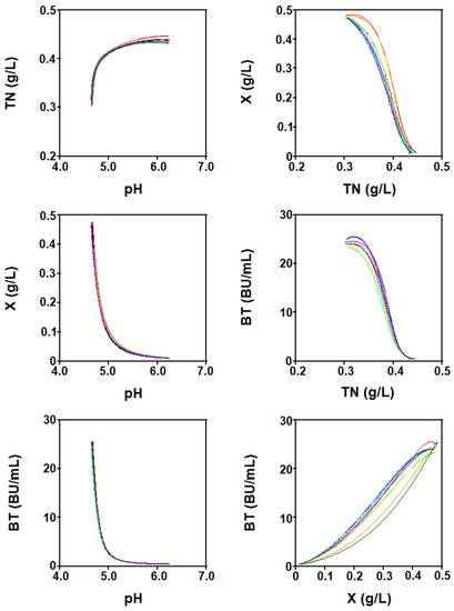 On the other hand, biomass production depends on different factors, including the initial medium composition (concentration and type of nutrients, mainly carbon, nitrogen, and phosphorous sources), initial and final pH values in the cultures, pH evolution, and production of inhibitory compounds [5,16,17,18]. Nisin synthesis depends not only on the time course of biomass concentration, but also on (i) the amount of biomass produced, (ii) the initial concentration and type of nutrient (carbon, nitrogen, and phosphorous sources), and (iii) initial and final pH value, pH evolution, and pH drop generated in the cultures [5,8,12,16,17,18]. So that the specific effects of these factors on the response variables (culture pH, TN consumption, biomass, and nisin production) could be non-synchronous, producing a different change in the time course of the latter variables and, consequently, in their relationships.