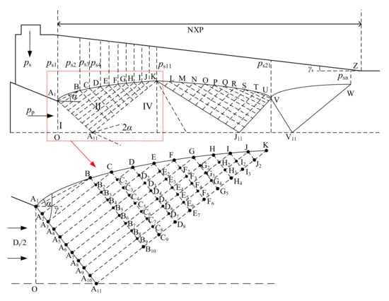Since the flow is deflected counterclockwise after passing through the expansion wave, the expansion wave system A1OA11 is a right-extension expansion wave, and the expansion angle α of the flow can be obtained by Prandtl–Meyer function [29]: