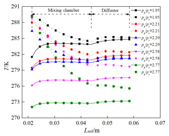 Figure 5 shows the temperature distribution of the primary flow and secondary flow along the path of the mixing chamber and diffuser under different expansion ratios pp/ps. The temperature of the primary flow is represented with a solid line, and for the secondary flow a dashed line. It can be seen from Figure 5 that the temperature of the primary flow along the path gradually increases, while the temperature of the secondary flow gradually decreases, and the temperatures of the two fluids tend to be equal in the flow process. This is mainly due to the supersonic expansion of the primary flow in the nozzle and the suction chamber, resulting in its temperature lower than that of the secondary flow. In the process of energy transfer between the two streams in the mixing chamber and diffuser, the secondary flow will condense and release heat into the primary flow, making the temperature of primary flow rise until the temperature of the two streams reaches equilibrium. Moreover, the temperature difference between the two streams at the entrance of mixing chamber is largest, which accelerates the energy transfer rate. In addition, for the small expansion ratio, the temperature of primary flow rises rapidly at the initial stage of mixing, while the large expansion ratio makes the secondary flow temperature decrease significantly in the mixing process. The final temperature difference between the two streams is 2.4 K at high expansion ratio (pp/ps = 2.77), and it is higher than that at low expansion ratio (pp/ps = 1.95) where the temperature difference is only 0.32 K. Due to the limitations of existing ejector structure, the energy exchange between two streams cannot be completed in a limited space. Therefore, it is necessary to optimize the mixing process of the ejector to improve energy transfer efficiency.