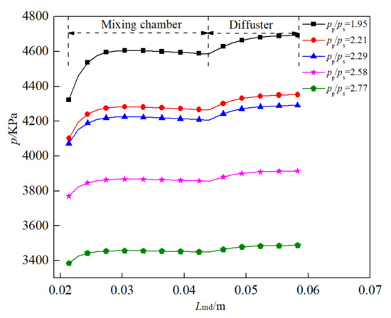 Figure 7 shows the pressure distribution along the mixing chamber and diffuser under different expansion ratios pp/ps. At the initial stage of the mixing chamber, the fluid pressure increases rapidly, and at the five expansion ratios, the pressure increase at the initial stage of the mixing chamber (the first 15% of the total length of the mixing chamber) accounts for 73.7%, 69.3%, 67.2%, 65.1%, and 63.9% of the total pressure increase, respectively. With the increase in expansion ratio, the proportion of pressure lift in the initial stage of the mixing chamber decreases gradually. In the diffuser, the pressure increase is more obvious at a smaller expansion ratio. It can be seen that the pressure lift at the initials stage of the mixing chamber is obvious, but in the final one it decreases in the case of a large expansion ratio. This is reasonable because the velocity difference between the two streams increases with the decline of expansion ratio, as shown Figure 6. When the fluid enters the mixing chamber, the flow cross-sectional area decreases, and more kinetic energy is transformed to pressure energy for a smaller expansion ratio. Thus, the smaller expansion ratio is helpful for increasing mixing pressure.