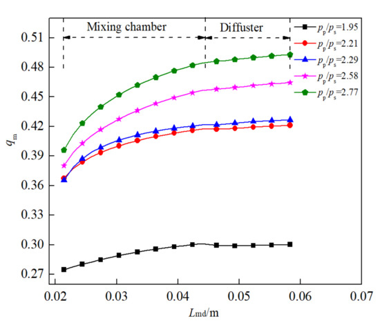 Figure 8 shows the distribution of the gas-phase mass fraction of the primary flow qm along the path of the mixing chamber and diffuser under different expansion ratios pp/ps. The gas-phase mass fraction qm increases gradually along the path of the mixing chamber and diffuser, and the largest increase is in the mixing chamber. This is because when just entering the mixing chamber, the temperature difference between the primary flow and the secondary flow is large, which accelerates energy transfer. The primary flow temperature increases, and leads to an increase in gas-phase mass fraction of primary flow qm. After entering the diffuser, the temperature difference between the two streams is relatively small, and the increase range of qm decreases. In addition, a larger expansion ratio of pp/ps leads to a larger increase in qm. The foremost reason for this is that the large temperature difference between the two streams under a large expansion ratio makes energy exchange more intense and leads to a larger increase in qm.